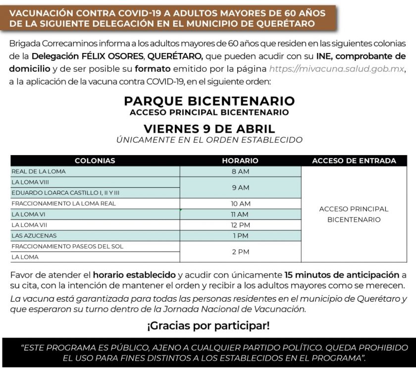 Los habitantes de las colonias Ampliación Loma Bonita, Claustros de la Loma, Loma Bonita Sección Prados, Fraccionamiento La Loma Real Querétaro, Lomas de Satélite, Paseos de La Loma, Fraccionamiento Loma de Montes Sion I y II, deberán acudir al Parque Bicentenario, por el acceso al Lienzo Charro, el viernes 9 de abril.