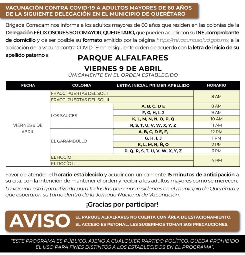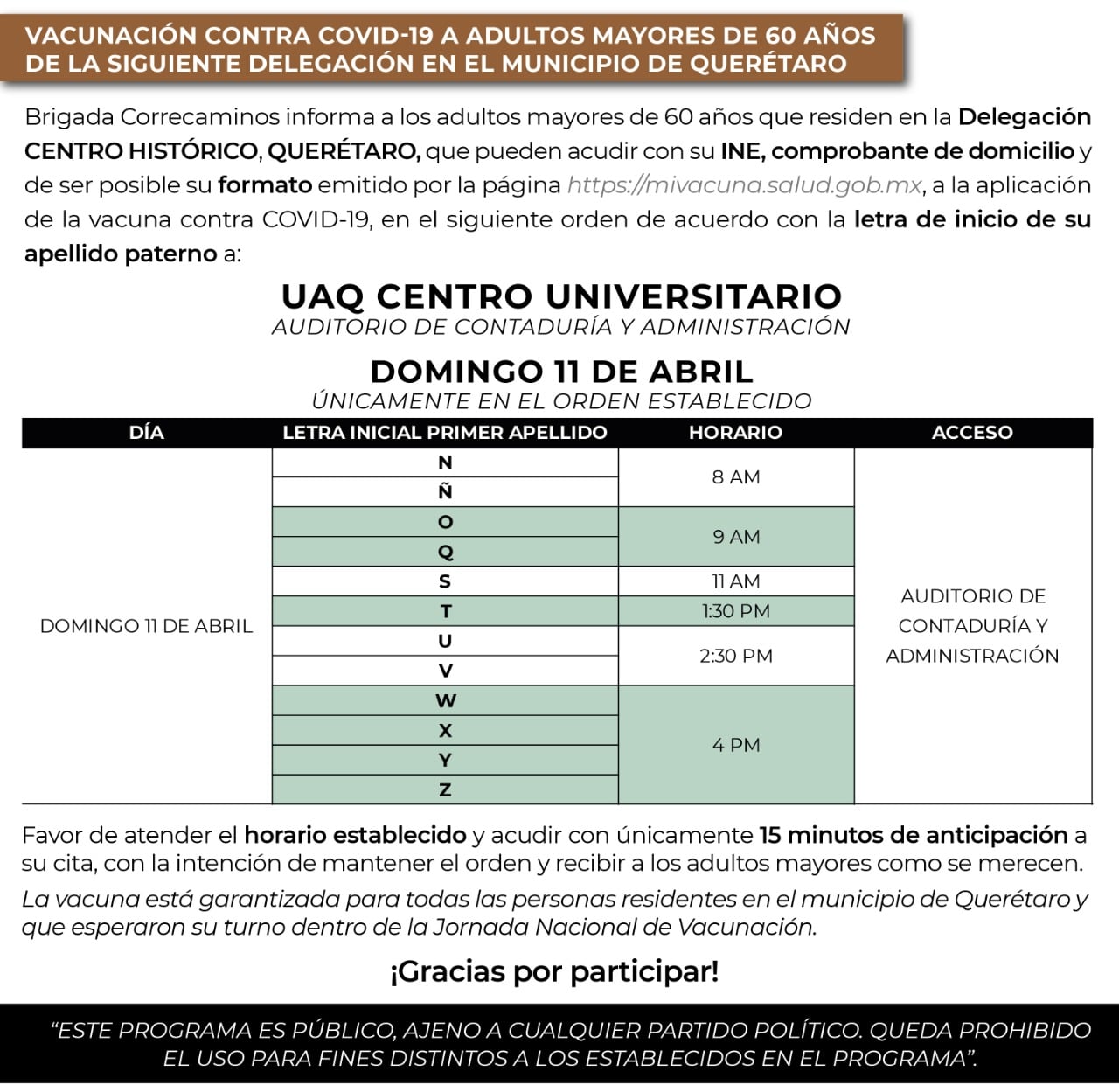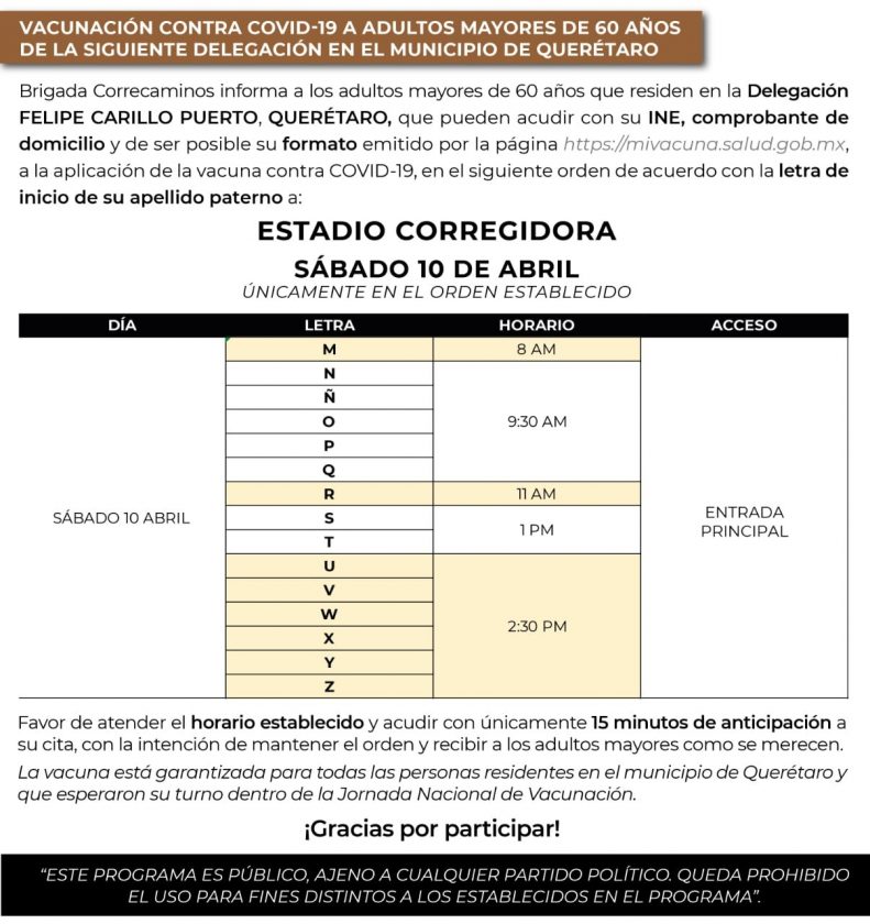 Los habitantes de la delegación Felipe Carrillo Puerto deberán acudir al Estadio Corregidora. El viernes 9 de abril toca el turno a las personas cuya letra inicial del primer apellido sea A, B, C, D, E, F, G, H, I, J, K y L.