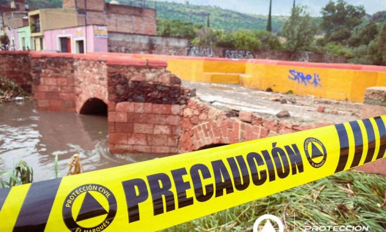 Tras la intensa lluvia registrada desde las 19:05 horas del viernes 22 de agosto, el Río Querétaro se desbordó en la cabecera municipal de El Marqués, lo que ocasionó afectaciones en viviendas, calles y el colapso parcial de un hombro del puente peatonal que conecta el balneario El Piojito con el andador Venustiano Carranza. Por seguridad, la autoridad ordenó el cierre total al paso peatonal.