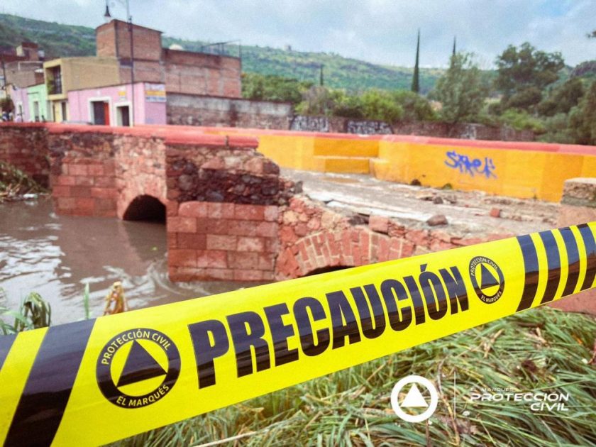 Tras la intensa lluvia registrada desde las 19:05 horas del viernes 22 de agosto, el Río Querétaro se desbordó en la cabecera municipal de El Marqués, lo que ocasionó afectaciones en viviendas, calles y el colapso parcial de un hombro del puente peatonal que conecta el balneario El Piojito con el andador Venustiano Carranza. Por seguridad, la autoridad ordenó el cierre total al paso peatonal.