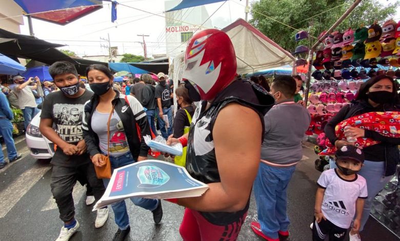 Varios luchadores recorrieron esta mañana las inmediaciones del Mercado del Tepe, con el fin de invitar a comerciantes y visitantes a seguir respetando las medidas sanitarias para evitar contagios de COVID-19, medidas como el uso de cubrebocas, aplicación de gel antibacterial y mantener la sana distancia; todo esto con el fin de continuar con la apertura de negocios y la reactivación de la economía local.