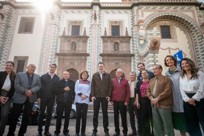 El gobernador Mauricio Kuri González, junto con el presidente municipal capitalino, Felifer Macías Olvera, supervisó los trabajos de conservación en la fachada del Templo Santa Rosa de Viterbo, uno de los monumentos más representativos del barroco de Querétaro del siglo XVIII.