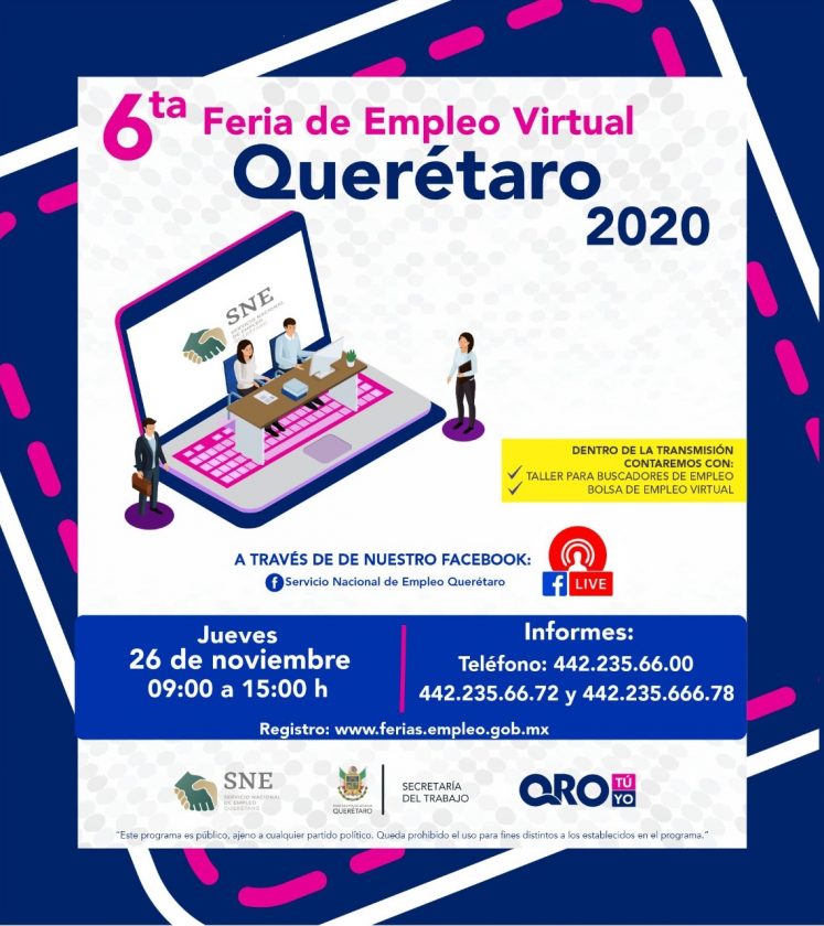 El jueves 26 de noviembre tendrá verificativo de 9:00 a 14:00 horas, la 6ª Feria de Empleo Virtual en Querétaro, con una oferta de 500 vacantes de todos los niveles educativos.