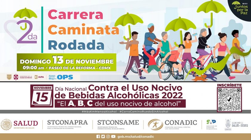 En el marco del Día Nacional Contra el Uso Nocivo de Bebidas Alcohólicas, la Secretaría de Salud (SESA) del estado de Querétaro, invita a la 2ª Carrera virtual 2022, a realizarse este domingo 13 de noviembre de 2022, entre las 0:01 y las 23:59 horas, en la que los participantes tendrán la oportunidad de correr, caminar, rodar, usar patines, patineta, monopatín o cualquier vehículo no motorizado.