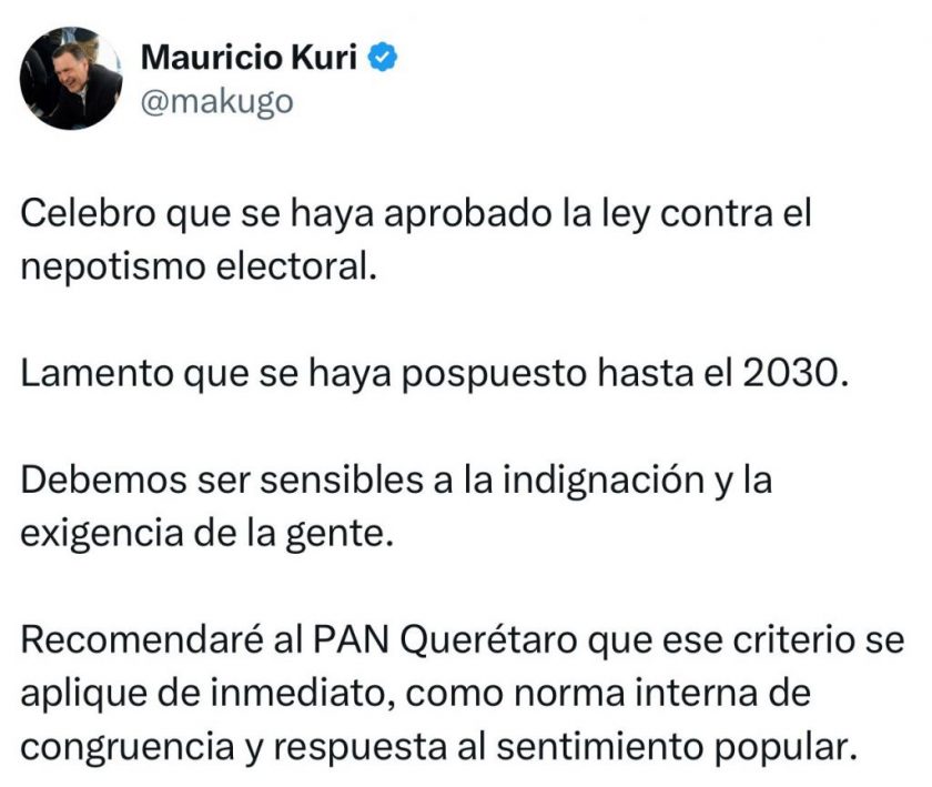 El gobernador del estado, Mauricio Kuri González, celebró la aprobación de la reforma federal contra el nepotismo electoral y aseguró que recomendará al PAN en Querétaro, aplicarla de inmediato y no esperar hasta el 2030, luego de que fue aplazada formalmente hasta esa fecha en el Senado.