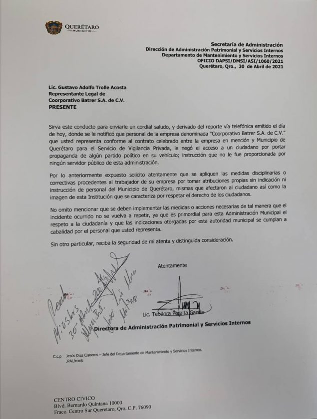 Así consta en el oficio DAPSI/DNSI/ASI/1060/2021 girado por la directora de administración del municipio de Querétaro, Teodora Peralta García, hacia Gustavo Adolfo Trolle Acosta, representante legal de la empresa de vigilancia privada encargada del acceso del edificio público.