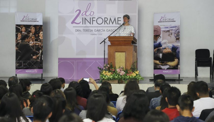 Con el objetivo de acercar la información del quehacer de la Universidad Autónoma de Querétaro (UAQ) a toda la comunidad universitaria, la rectora de esta Casa de Estudios, Dra. Teresa García Gasca, llevó su 2º Informe de Actividades al campus San Juan del Río.