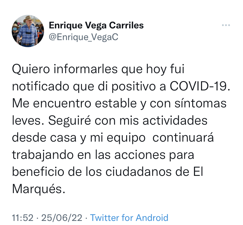 «Quiero informarles que hoy fui notificado que di positivo a COVID-19. Me encuentro estable y con síntomas leves. Seguiré con mis actividades desde casa y mi equipo continuará trabajando en las acciones para beneficio de los ciudadanos de El Marqués», publicó en sus redes sociales.