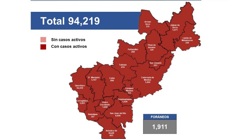 En Querétaro se registra 26 por ciento de ocupación de camas con ventilador y 33 por ciento en camas sin ventilador. Se exhorta a la población a no automedicarse y, para prevenir la transmisión, lavarse las manos de manera frecuente con agua y jabón o utilizar soluciones alcoholadas a 70%, usar cubreboca al salir de casa y mantener sana distancia entre personas (de 1.5 a dos metros).