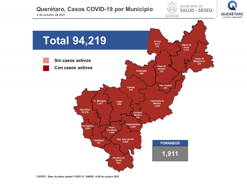 En Querétaro se registra 26 por ciento de ocupación de camas con ventilador y 33 por ciento en camas sin ventilador. Se exhorta a la población a no automedicarse y, para prevenir la transmisión, lavarse las manos de manera frecuente con agua y jabón o utilizar soluciones alcoholadas a 70%, usar cubreboca al salir de casa y mantener sana distancia entre personas (de 1.5 a dos metros).