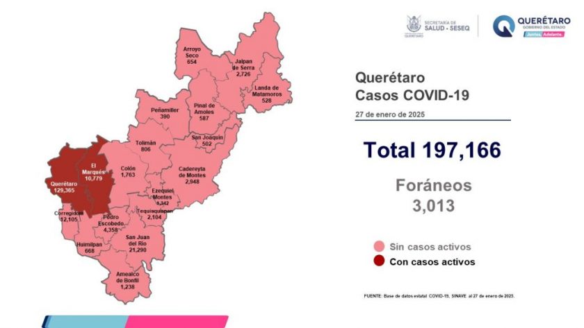 La Secretaría de Salud de Querétaro reportó este lunes cero defunciones por COVID-19, y que en los últimos siete días se han sumado cinco casos de la enfermedad en el estado, se trata de tres mujeres y dos hombres. El registro acumulado es de 197 mil 166 casos; 54 por ciento son mujeres y 46 por ciento son hombres.