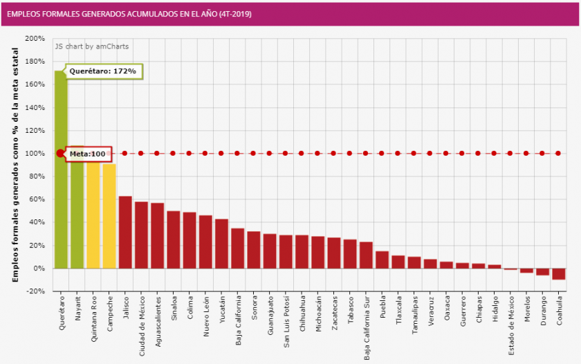 De acuerdo con la consultora México ¿Cómo vamos? el estado de Querétaro fue la entidad que mejor cumplió con su meta de empleos generados durante 2019, al generar 31,061 puestos de trabajo.