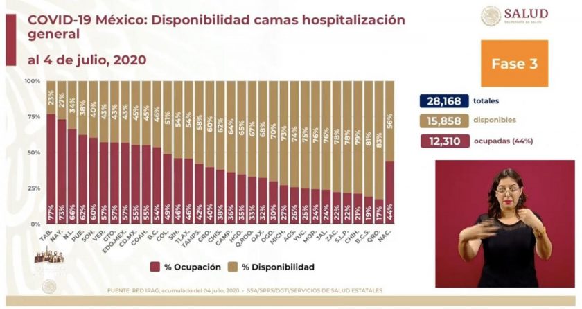 La ocupación hospitalaria de camas generales en México está al 44%; los estados de Tabasco (77%) y Nayarit (73%) tienen este domingo la mayor ocupación hospitalaria; Baja California Sur (19%) y Querétaro (17%) tienen las ocupaciones más bajas.