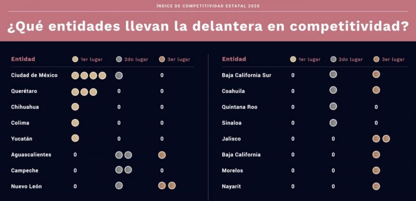 El índice no realizó un ranking general para las entidades federativas, en esta ocasión otorgó “medallas” de oro, plata y bronce para los estados con mejor desempeño en diferentes variables como Estado de Derecho, medio ambiente, sociedad, sistema político, gobierno, mercado de factores, economía, precursores, relaciones internacionales e innovación.