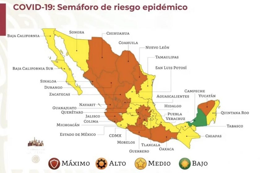 En el semáforo epidémico vigente para las próximas dos semanas hay cero entidades en color rojo (riesgo máximo), 17 estados en color naranja (riesgo alto), 14 estados en amarillo (riesgo moderado) y un estado en verde (riesgo bajo).