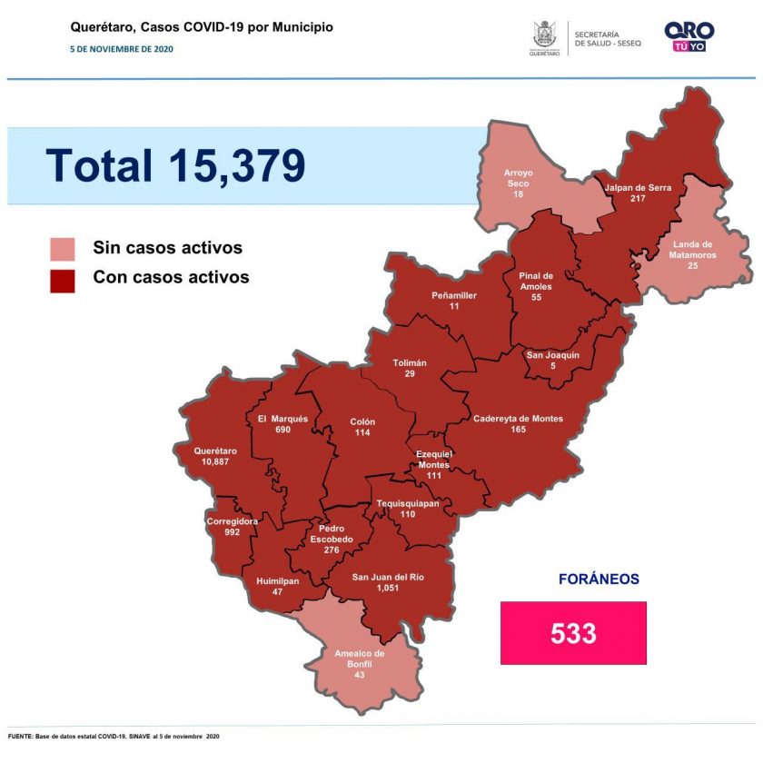 El estado de Queretaro sumó hoy 296 casos de COVID-19; se trata de 143 mujeres y 153 hombres.