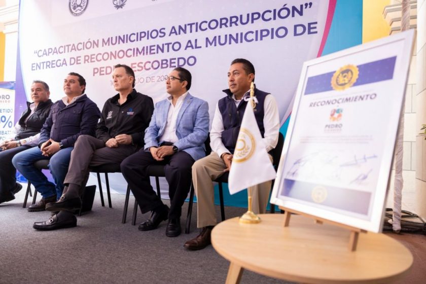 El gobernador, Mauricio Kuri González, atestiguó la entrega del reconocimiento «Capacitación Municipio Anticorrupción» que otorgó la Secretaría de la Contraloría al presidente municipal de Pedro Escobedo, Juan Alberto Nava Cruz, por certificar a la totalidad de su personal operativo y administrativo en el curso “Servidor Público Anticorrupción”.