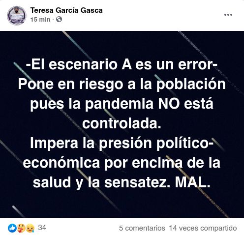 En su punto de vista, al pasar al Escenario A “impera la presión político-económica” por encima de la salud de la población.