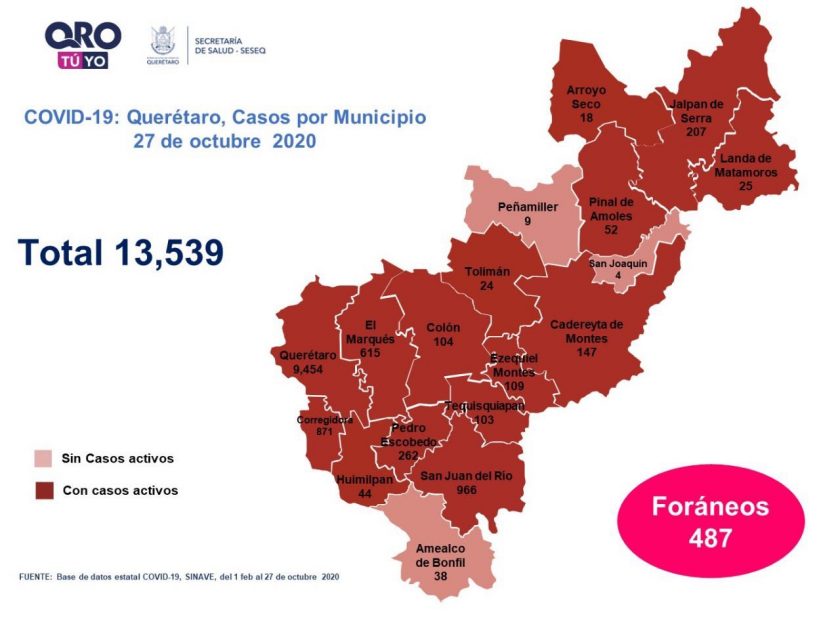 Querétaro tiene un registro acumulado de trece mil 539 casos de COVID-19; 47% son mujeres y 53% son hombres.