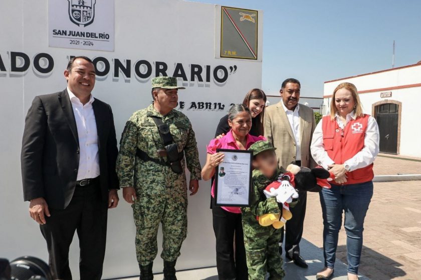 El presidente municipal de San Juan del Río, Roberto Cabrera Valencia; la presidenta del Sistema Municipal para el Desarrollo Integral de la Familia (DIF), Georgina Sánchez Barrios, y el comandante del Séptimo Regimiento Mecanizado La Llave, Óscar Alfonso Zenteno Villagómez, encabezaron la ceremonia del Programa Soldado Honorario, que distinguió a Guadalupe Nieto Hernández y Abigail Juárez Camacho, como soldados Honorarios del Arma Blindada.