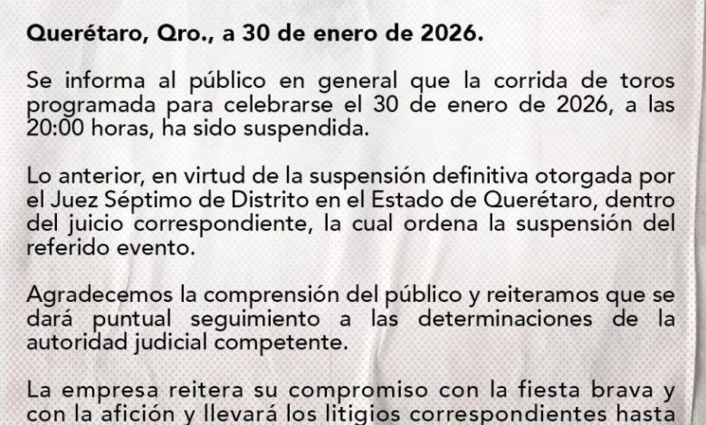 A través de un comunicado dirigido al público en general, la empresa informó que la suspensión obedece a una resolución emitida por el Juez Séptimo de Distrito en el Estado de Querétaro, quien concedió una suspensión definitiva dentro del juicio correspondiente, misma que ordena detener la realización del espectáculo taurino.