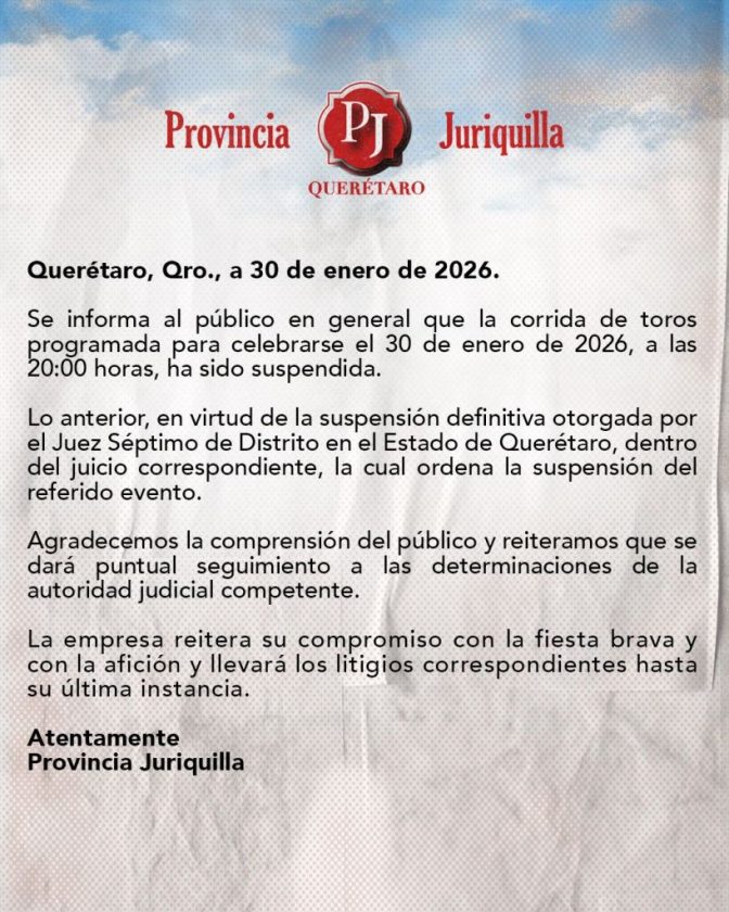 A través de un comunicado dirigido al público en general, la empresa informó que la suspensión obedece a una resolución emitida por el Juez Séptimo de Distrito en el Estado de Querétaro, quien concedió una suspensión definitiva dentro del juicio correspondiente, misma que ordena detener la realización del espectáculo taurino.