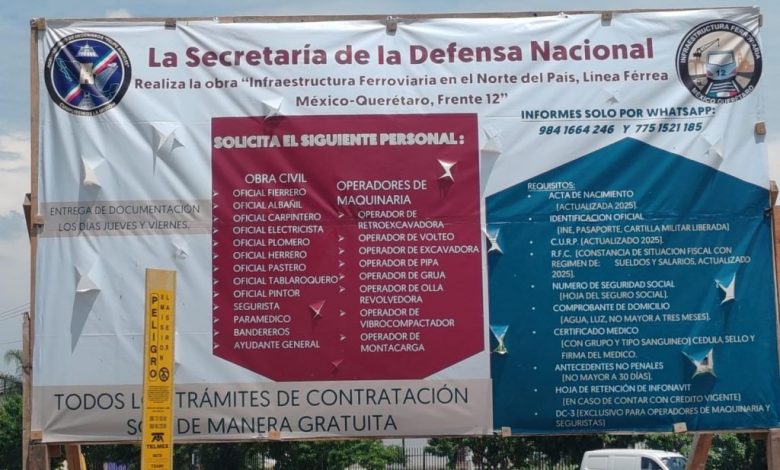 La Secretaría de la Defensa Nacional, a través del grupo de ingenieros militares “Felipe Ángeles”, lanzó una convocatoria de empleo dirigida a quienes deseen integrarse a las obras de la línea férrea México-Querétaro. El aviso se encuentra en una lona ubicada cerca de las vías del tren, en la colonia Los Héroes, municipio de El Marqués.
