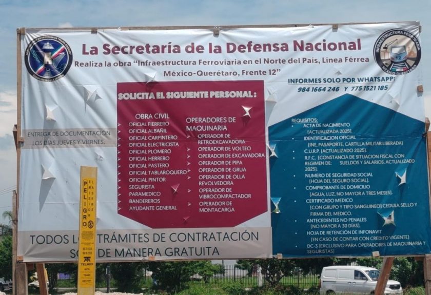 La Secretaría de la Defensa Nacional, a través del grupo de ingenieros militares “Felipe Ángeles”, lanzó una convocatoria de empleo dirigida a quienes deseen integrarse a las obras de la línea férrea México-Querétaro. El aviso se encuentra en una lona ubicada cerca de las vías del tren, en la colonia Los Héroes, municipio de El Marqués.