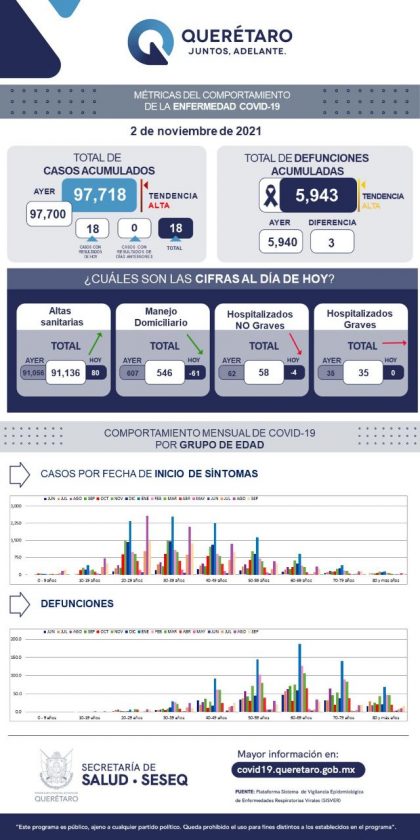 Con tres defunciones y tan solo 18 nuevos casos de COVID-19 cerró esta jornada de acuerdo al reporte de la Secretaría de Salud, una de las cifras más bajas de los últimos meses en Querétaro.