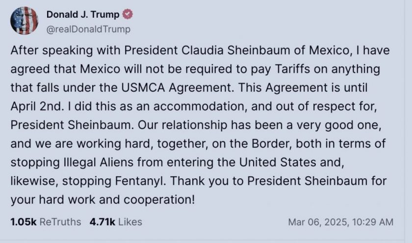 Donald Trump anunció en Truth Social que México no pagará aranceles por productos bajo el Tratado México-Estados Unidos-Canadá (T-MEC) hasta el 2 de abril, como «gesto de respeto» a la presidenta Claudia Sheinbaum.