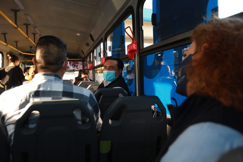 El Presidente Municipal de Querétaro, Luis Nava, acudió a la salida del personal administrativo del Centro Cívico para saludar a los primeros usuarios del Programa de Transporte Generalizado que les apoyará con un traslado rápido, económico y seguro entre el trabajo y sus hogares, y con el que además se reducirán vehículos transitando por la ciudad.