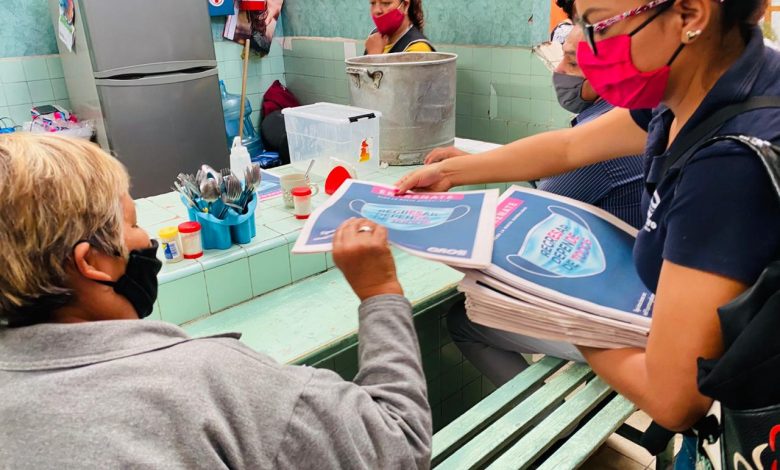 En la tarea de seguir promoviendo las medidas de prevención sanitaria que permitan seguir adelante con la reactivación de la economía local, la Delegación Centro Histórico, en coordinación con cámaras empresariales y comerciantes en general, realizó una jornada más de promoción del uso del cubrebocas, ahora en las inmediaciones del Mercado Hidalgo.